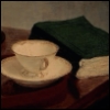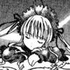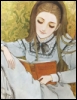 Description: A vintage colored manga style illustration of a girl wearing a mid Victorian style light blue dress with fair skin light brown straight hair and downturned eyed reading a book.